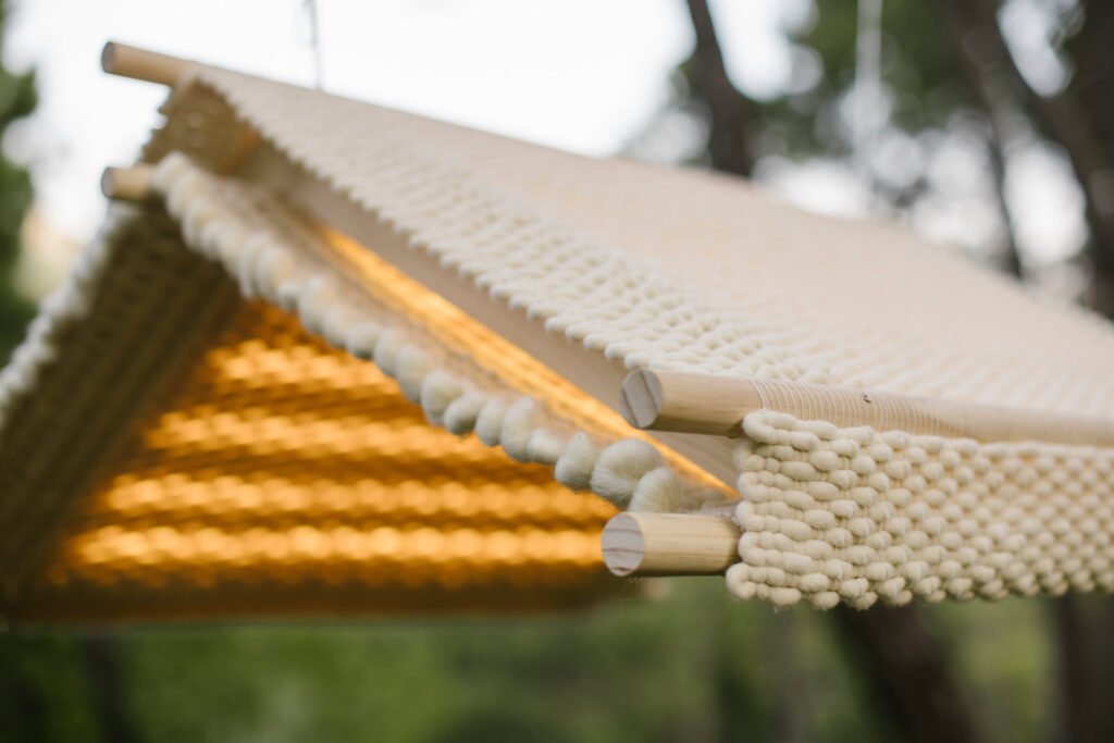 Fruto de esta experimentación nace Cobijo, un objeto funcional con carácter escultórico. La pieza consiste en un techo acústico en suspensión con propiedades fonoabsorventes que mejoran la calidad de escucha de un espacio. Para realzar la singularidad de los tejidos, en su interior se aloja un sistema de iluminación led controlado mediante Arduino que permite retroiluminar el tejido y darle vida, convirtiendo al objeto en cuestión en una lámpara de luz tenue y creando un ambiente cálido y acogedor. Un refugio sonoro y sensorial que invita a la contemplación y la relajación.