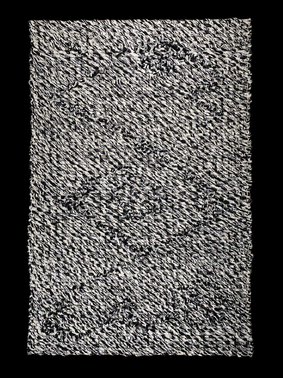 Está tejido con dos lanzaderas diferentes, de barco y de alfombra. La fibra usada es lana y un cordón de fibras naturales, hilado a mano con 19 hebras de fibras diferentes. Entre ellas: lino, lanas, seda, alpaca, mohair y algodones en distintas gamas cromáticas. Este cordón está hilado a mano dando una torsión conjunta poco pronunciada, para dejar entrever cada color y fibra. Cada porción de cordón cortado, representa esos pensamientos de toma de conciencia, (como destellos). Diferentes de los miles de pensamientos que podemos tener a lo largo del día.