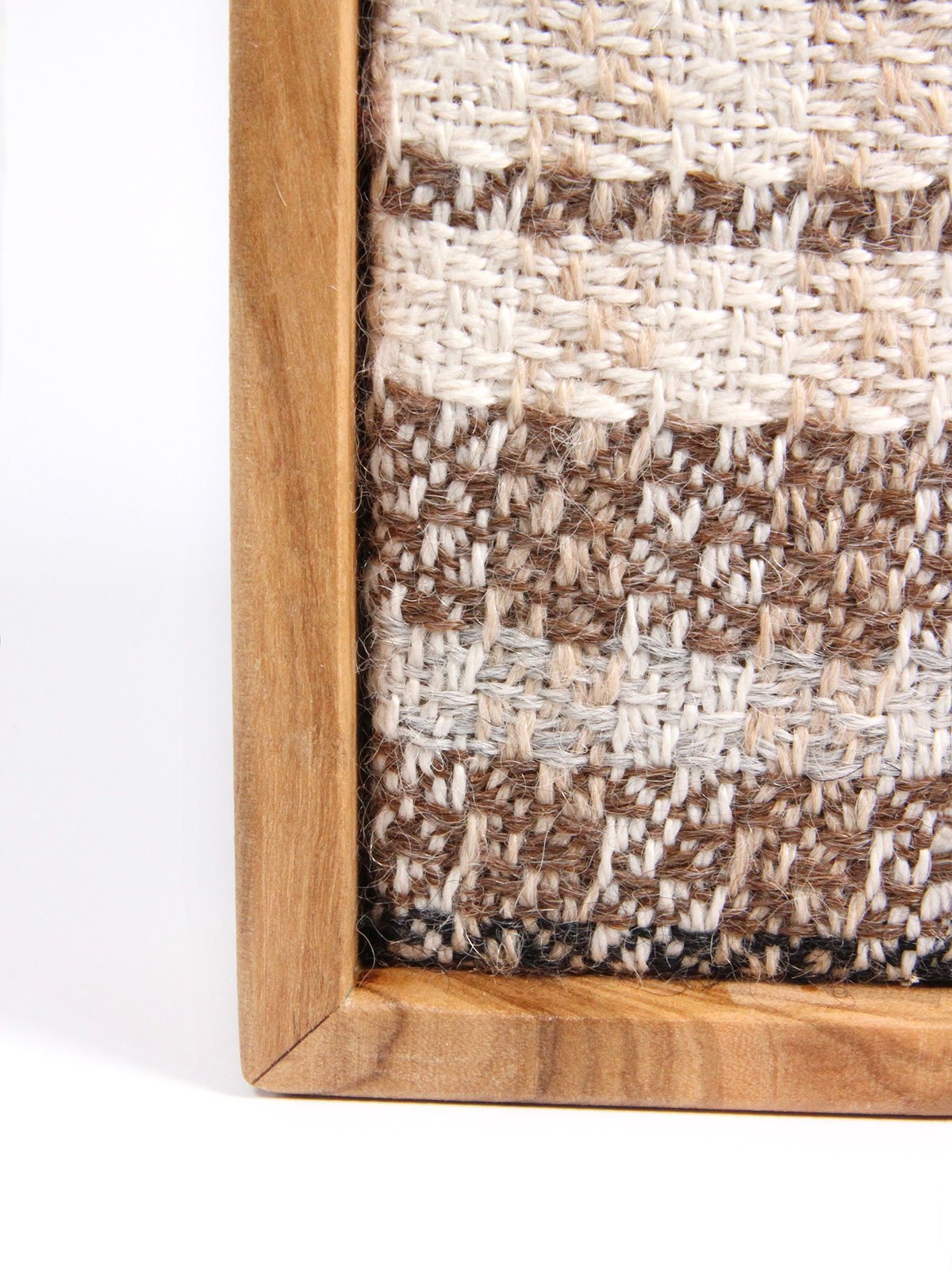 Una vez fuera del telar, está montado en un marco-soporte de madera de olivo que puede colocarse sobre mobiliario o pared, con laterales a modo de caja, que invitan a tocar y le ayuda a mantener la forma.