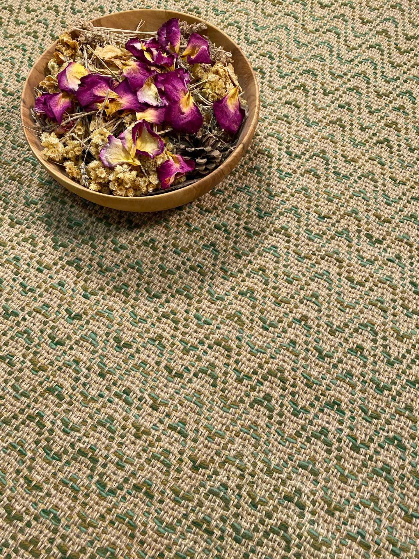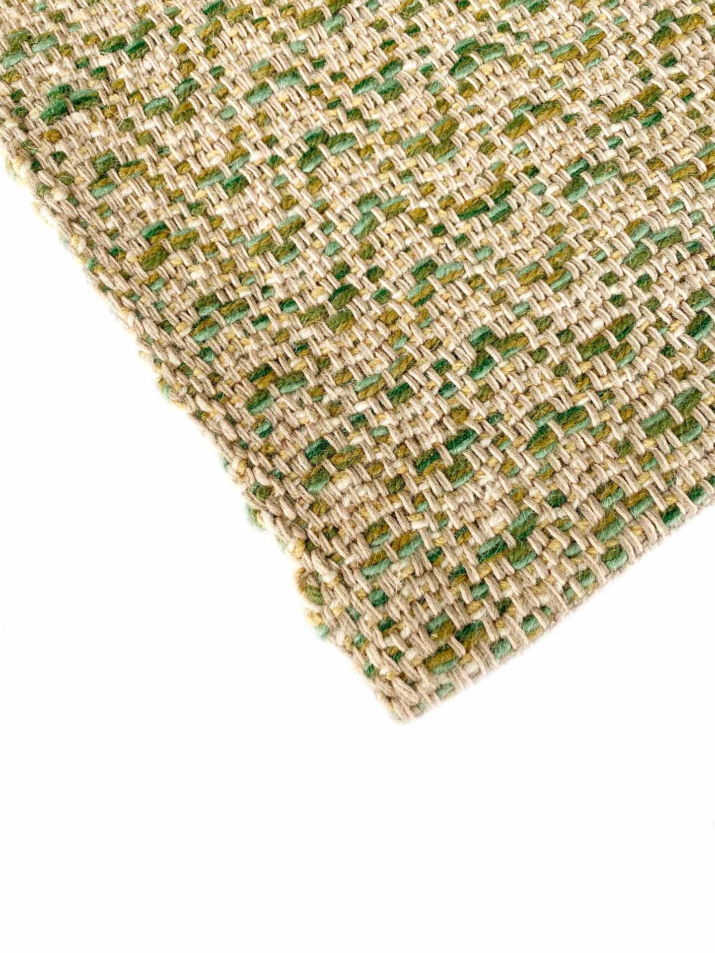 Alfombra de lana y algodón tejida a mano en telar, es suave, cálida, confortable y resistente. Esta alfombra la hemo tejido con lana que retiene muy bien el calor, su tacto es denso invitando a pisar, sobre todo descalzos. Es una alfombra muy versátil. Hemos tejido en varios tonos verdes con varias hebras, para que pueda combinar con diferentes estilos de decoración, adaptándose al mobiliario que acompañe, creando un ambiente acogedor, diferente y único. Podemos tejerla bajo pedido personalizado, en medidas y colores para que se adapten lo mejor posible a tu gusto. Consúltanos.