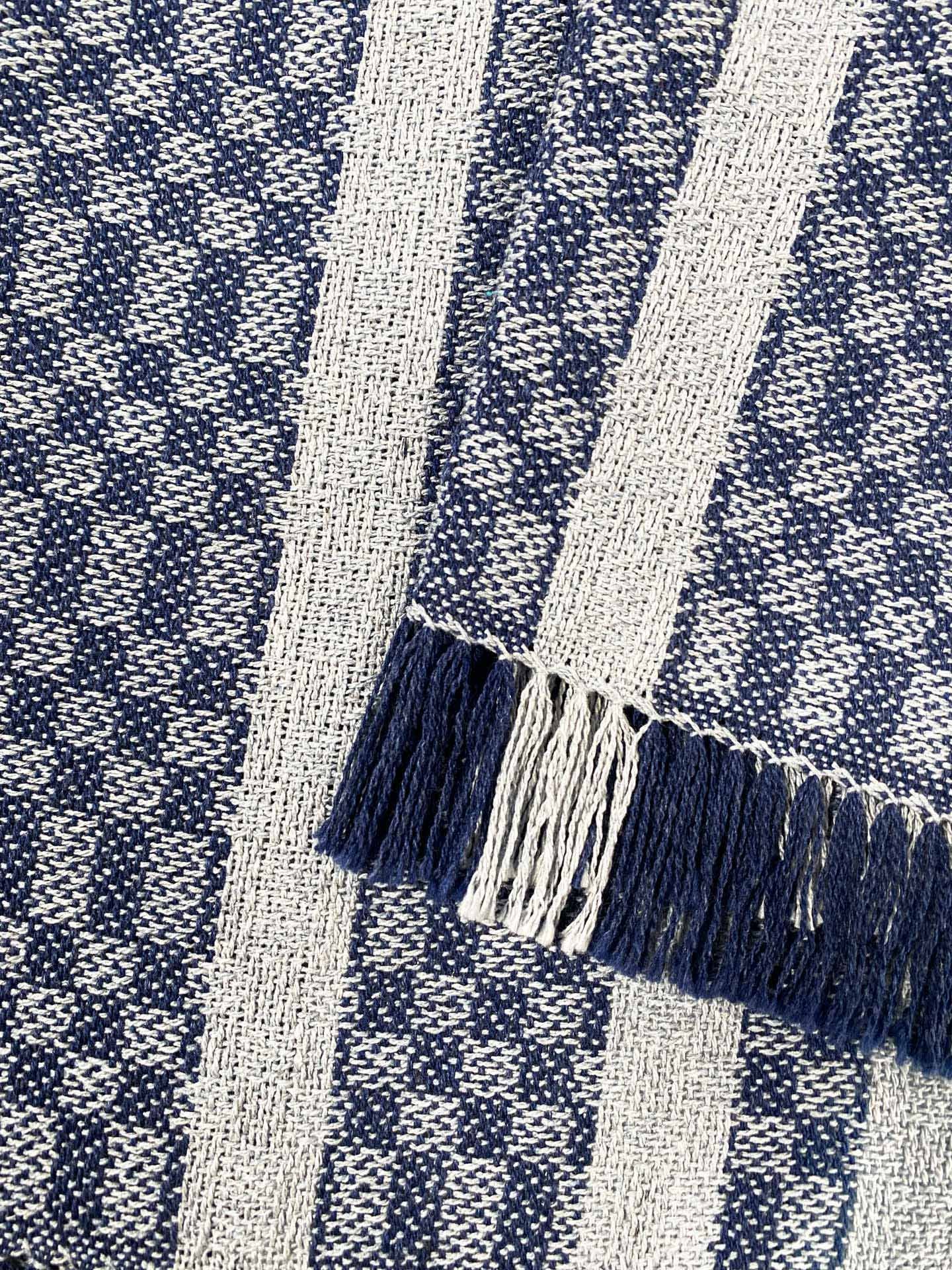 Esta bufanda la hemos tejido a mano con una variante compleja de bloques sarga, esta técnica nos permite tejer piezas muy versátiles, con líneas marcadas que generan cuadrículas horizontales y verticales, con un patrón de dibujo marcado repetitivo muy llamativo y bonito. Es un tejido ligero suave y duradero.