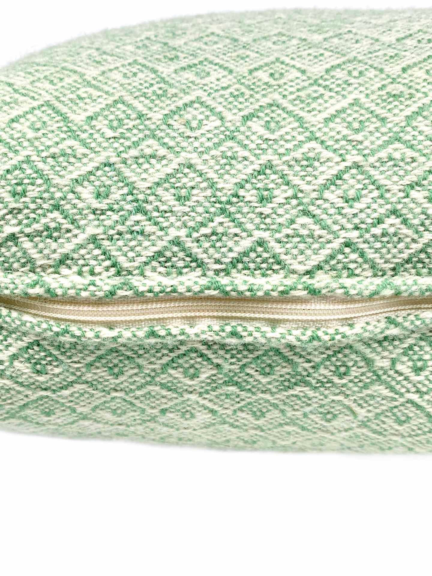 Cojín de lana merina tejido a mano en telar. Beige y verde.